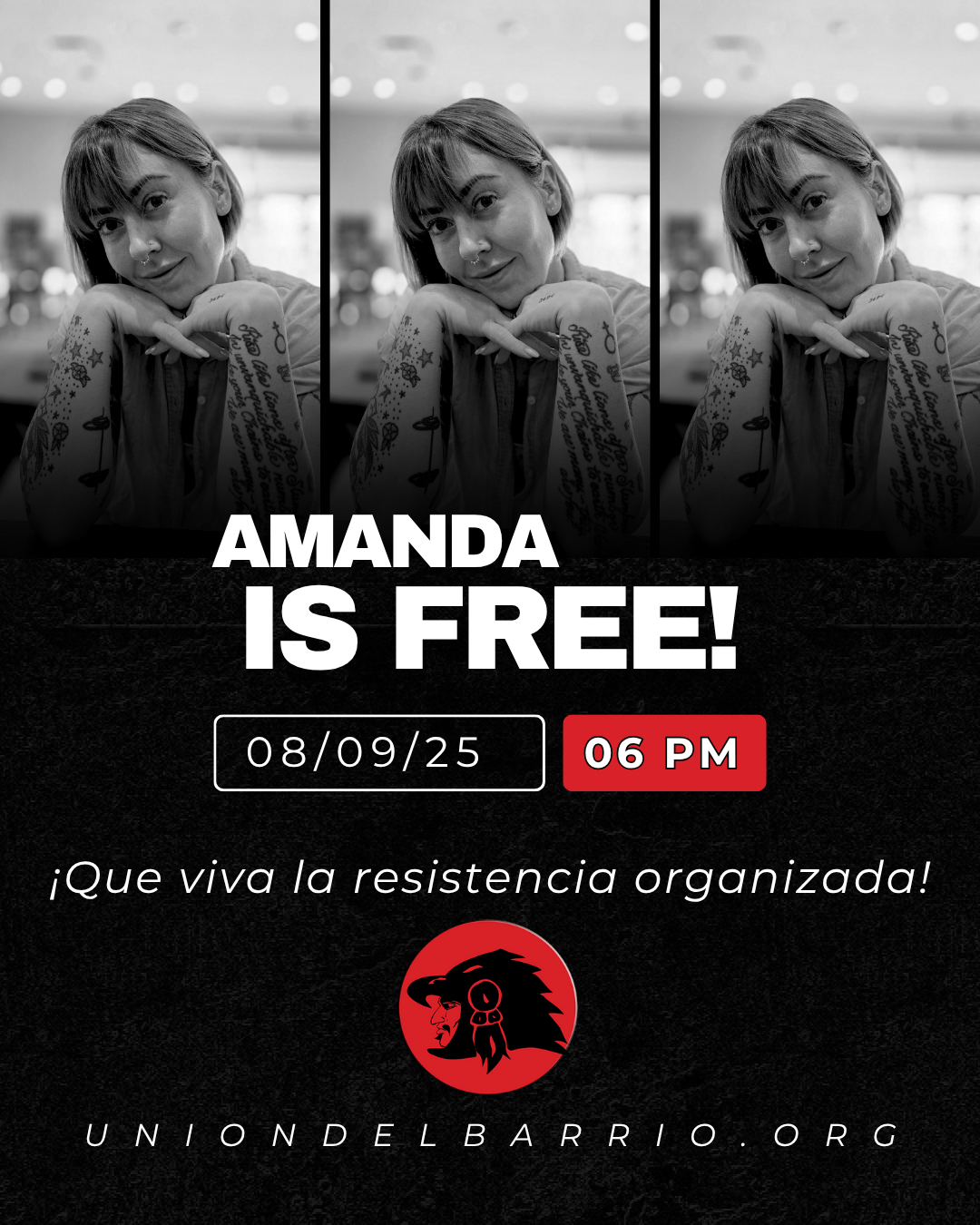 Unión del Barrio deeply appreciates the support and effort of thousands of people to secure the release of our comrade Amanda. Infinite thanks to each person who took the time to call for her freedom, to march in front of the detention center where she was being held, to our legal team for their support, as well as to the thousands of our sisters and brothers who unified their voices to defend our brave comrade! We are grateful to the Harbor Area Peace Patrol who have been resisting, documenting, and organizing for months in the area around Terminal Island. We recognize that without members of this collective who took video and quickly reported Amanda’s violent detention and illegal arrest, the case would likely have taken a different course.